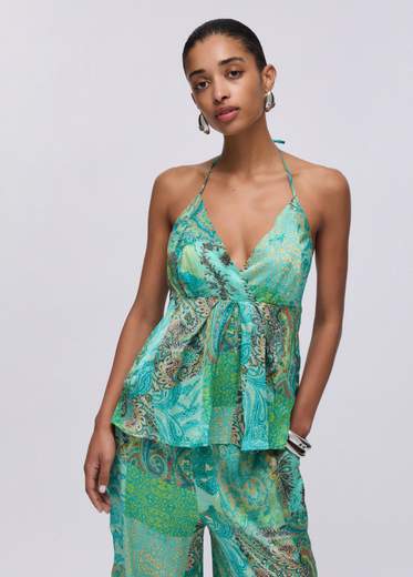 Top con scollo a V, Filati in pura viscosa, Stampa cachemire all-over, Allacciatura dietro il collo.