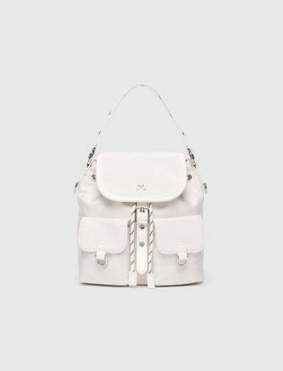 Zaino piccolo con logo in metallo verniciato on tone sulla patta e tag stampato sul retro, Manico corto rimovibile in tessuto spalmato con occhielli, Tracolla rimovibile e regolabile e spallacci rimovibili per portata a zaino, Chiusura con patta, magnete e coulisse, Taschine esterne con magnete, Accessori metallici con finitura nikel lucido.