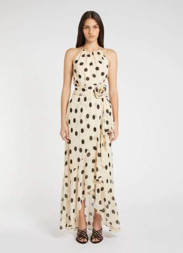 Abito con volant e rosa in tessuto.L'eleganza leggera del pois, in un abito che racconta l'estate. Femminilità e tocchi romantici si leggono nella vaporosità della georgette e nel maxi volant a fondo capo.