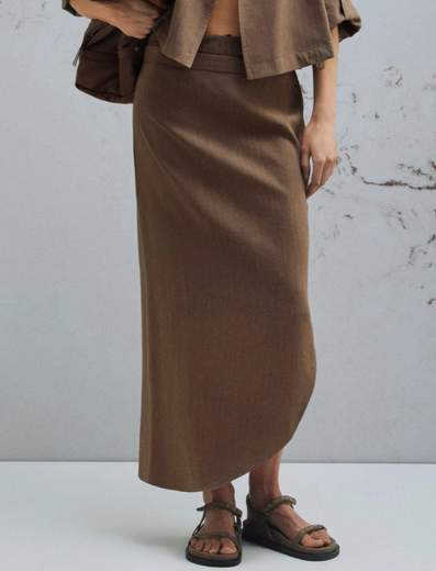 Gonna asimmetrica in creponne.Se cerchi una gonna dal look attuale, ecco la scelta perfetta per te: in creponne di misto lino, svela tutto il suo fascino nello spacco stondato sul fianco sinistro. Easy and chic.