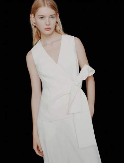 Top con fiocco in envers satin.Eleganza senza compromessi con questo top smanicato in un fluido envers satin. La chiusura incrociata con fiocco laterale attira lo sguardo sul punto vita, in un gioco di femminilità e linee attuali.