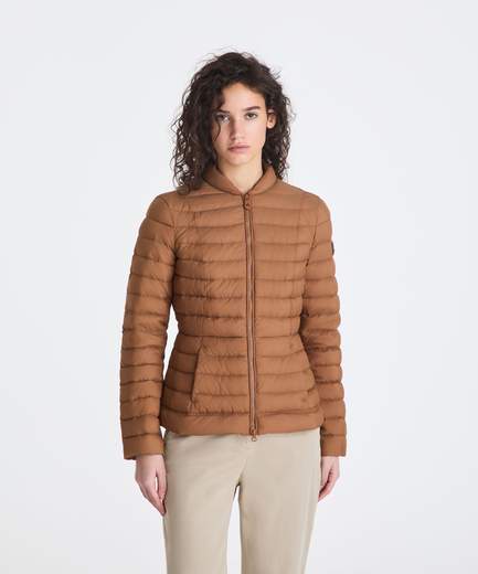 In nylon superleggero, Imbottitura in piuma naturale certificata, Full zip centrale, Colletto in piedi.