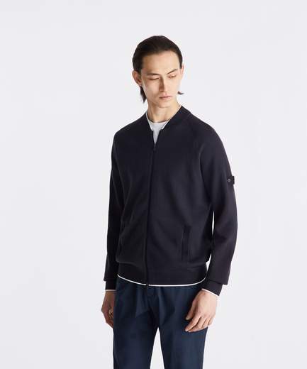 In tricot misto cotone e nylon, Effetto felpa, Full zip doppio cursore, Dettagli in maglina elastica, Collo in piedi.