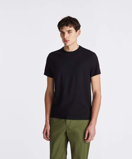 T-shirt in piquet stretch di cotone e seta, tinto in pezza, con logo ricamato sulla manica sinistra. Realizzata in un tessuto morbido, leggero e traspirante, è ideale per affrontare per la bella stagione con stile e comfort. Un modello versatile e moderno, perfetto come base per ogni guardaroba estivo, grazie alle sue infinite possibilità di abbinamento, per uno stile sempre impeccabile.