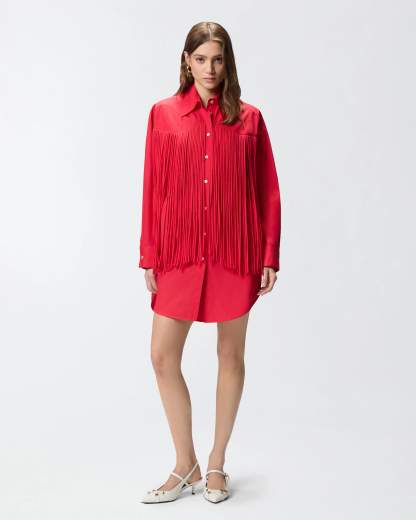 Abito corto chemisier con frange.Vestito corto stile chemisier dalla linea dritta, dotato di maniche lunghe, colletto a camicia, abbottonatura frontale e polsini con bottone. Il modello è realizzato in popeline di puro cotone dalla mano fresca e asciutta, ed è caratterizzato da lunghe frange tubolari in leggero tessuto voile di cotone applicate a mano lungo il carré anteriore, per un omaggio allo stile texano. Completano l'abito l'iconico logo lettering PINKO ricamato e il carré leggermente a punta sul retro, anch'esso d'ispirazione country, rifinito da una doppia piega che dona ulteriore movimento.