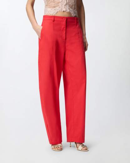 Pantaloni barrel-fit in cotone stretch.Pantaloni barrel-fit con gamba a palloncino morbida e arrotondata nella parte superiore e più stretta al fondo. Il modello è realizzato in confortevole gabardina di cotone stretch ed è foderato in puro cotone per una sensazione ancora più piacevole a contatto con la pelle. Completano il design i passanti per cintura, le tasche posteriori a filetto e la chiusura frontale con zip e bottone.