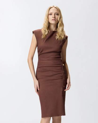 Abito longuette caratterizzato da una parte superiore con girocollo e maniche ad aletta appena accennate e da una gonna aderente, movimentata da delicati drappeggi sul davanti. Realizzato in misto lino e viscosa stretch dall'armatura a tela, un tessuto fiammato e luminoso che reinterpreta in modo innovativo il classico lino, il modello è completato da una comoda chiusura con zip invisibile sul retro, che facilita l'indosso mantenendo il design essenziale, e da un piccolo spacco sul fianco decorato da applicazioni metalliche. L'intramontabile design d'ispirazione tubino e il tessuto dal gusto estivo rendono questo vestito firmato PINKO la scelta ideale per dare vita a look raffinati e mai scontati da indossare di giorno come di sera.