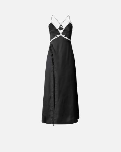 Abito lungo dalla linea morbida e svasata, realizzato in tessuto twill per un effetto ancora più fluido e scivolato, e dotato di una chiusura con zip invisibile su un lato per facilitare l'indosso. La parte superiore del capo si distingue per lo scollo a V, il design smanicato con nastrini sottili da allacciare sul retro del collo e il corpino impreziosito da inserti in pizzo ricamato d'ispirazione lingerie, mentre la gonna presenta un profondo spacco laterale sul davanti, regolabile tramite fettuccia e decorato da ganci metallici lasciati a vista. La leggerezza del tessuto e i seducenti dettagli che richiamano il mondo corsetteria rendono questo vestito un alleato perfetto da abbinare a un paio di sandali gioiello per un look da sera elegante ma con il tocco di unicità tipico di PINKO.