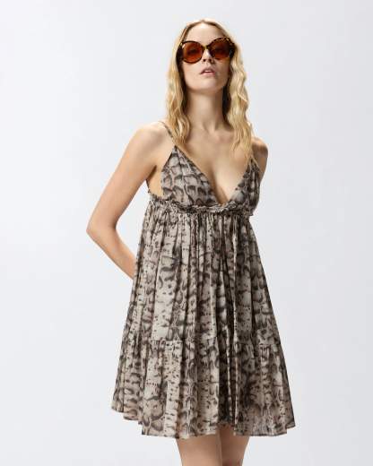 Abito corto contraddistinto da un accattivante disegno snake all over e realizzato in mussola di cotone con fodera interna, anch'essa in cotone, per assicurarti il massimo del comfort e della freschezza. Il capo presenta un design smanicato con sottili spalline regolabili, un profondo scollo a V e un inserto elasticizzato con bottoncino metallico frontale e piccole ruches sotto il seno da cui hanno origine morbide pieghe. Grazie alla silhouette vaporosa e femminile, messa ancora più in risalto dalla balza sul fondo, e alla fantasia grintosa e contemporanea, espressione del DNA PINKO, questo vestito è pronto a conquistare al primo colpo le fan dell'animalier e non solo.