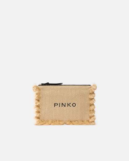 Piccola bustina dalla forma rettangolare e dal design piatto realizzata in rafia intrecciata, dal gusto particolarmente estivo, e personalizzata con il logo lettering PINKO ricamato a contrasto sul davanti. Il modello, da portare a mano, è ulteriormente arricchito da divertenti nappine in tono che ne profilano il contorno, e presenta una chiusura superiore con cerniera e tirazip in tessuto che rivela un interno foderato in drill di cotone e dotato di una comoda tasca a parete, anch'essa con zip.