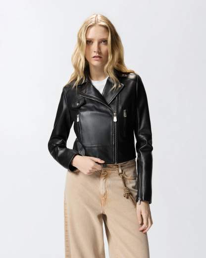NEW SENSIBLE CHIODO NAPPAGiacca chiodo stile biker realizzata in morbida nappa e dotata di chiusura con zip decentrata. Il capo è caratterizzato da un ampio revers con bottoni, tasche verticali con zip sul davanti, un taschino sul petto con patta e bottone e comode aperture con zip ai polsi. Il design è rifinito dall'iconico logo Love Birds in rilievo sul retro. Questo giubbino è una reinterpretazione contemporanea del classico chiodo biker in pelle, ed è perfetto per completare i tuoi look con un tocco di grinta che non rinuncia alla femminilità.