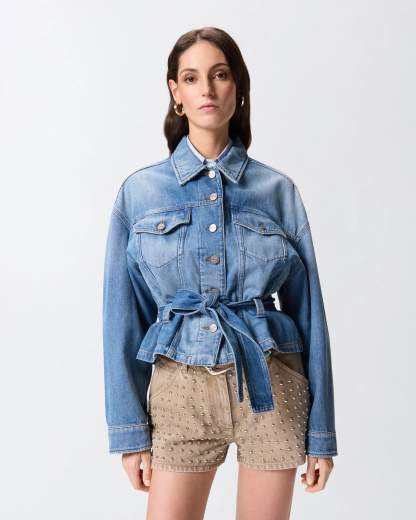 Giubbino con maniche lunghe e spalla scesa realizzato in denim di cotone e lyocell con tono di lavaggio medio e scoloriture per un accattivante effetto vissuto. Il modello presenta polsini con bottoni, due tasche con patta e bottone sul petto e due tasche a filetto laterali, ed è rifinito da una cintura rimovibile dello stesso tessuto da annodare in vita. Un capo versatile e contemporaneo che si presta a numerose opzioni di styling: provalo con i jeans abbinati per un intramontabile look total denim.