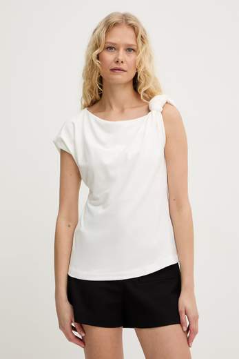 T-shirt a manica corta dal design raffinato e femminile, caratterizzata da uno scollo asimmetrico monospalla che lascia scoperta delicatamente una spalla. La linea è slim e leggermente sfiancata, pensata per valorizzare la silhouette senza costringere. Il dettaglio del drappeggio con nodo sulla spalla aggiunge movimento e un tocco elegante al capo. Realizzata in tessuto morbido ed elasticizzato, è confortevole da indossare e perfetta sia per look casual chic che per abbinamenti più ricercati.