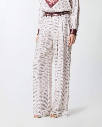 RUTH PANTALONE TWILLPantaloni a gamba dritta realizzati in twill di viscosa e caratterizzati da una stampa d'ispirazione foulard con motivo cravatteria all over. Il modello, dotato di chiusura con zip e bottone, presenta inoltre tasche laterali, una vita con motivo rigato a contrasto, passanti per cintura e raffinate pinces sul davanti. Trasforma il tuo outfit in un'opera d'arte e indossa questi pantaloni con la camicia abbinata per un total look originale che non ti farà passare inosservata.