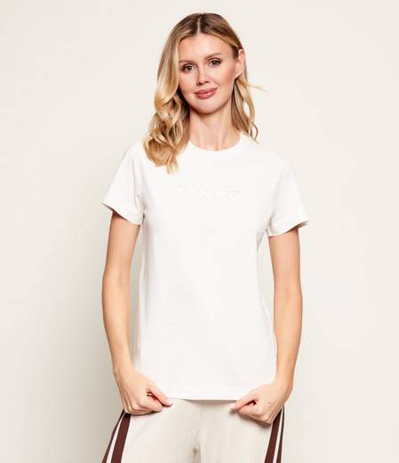 T-shirt a maniche corte realizzata in jersey di puro cotone con girocollo lavorato a costine sottili. Il modello è caratterizzato dall'iconico logo lettering PINKO sul petto sotto forma di ricamo in tono dal raffinato effetto lucido. Questa T-shirt si abbina con facilità ai tuoi pantaloni preferiti, elevando il tuo look in modo semplice, elegante e originale.