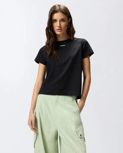 T-shirt girocollo a maniche corte realizzata in jersey di puro cotone. Il modello è personalizzato dal logo lettering PINKO in rilievo dall'effetto verniciato a contrasto sul petto. Essenziale e contemporanea, questa T-shirt diventerà un vero e proprio passe-partout del tuo guardaroba estivo e non solo.