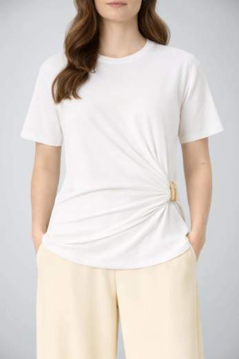 T-shirt girocollo a maniche corte realizzata in interlock stretch di cotone Supima, un tessuto di prima qualità caratterizzato da una mano morbida e compatta e da un effetto di lucentezza. A impreziosire il capo non poteva mancare il dettaglio glamour in puro stile PINKO: un'applicazione dorata in corrispondenza della vita che crea un raffinato drappeggio sul davanti. Un capo versatile, semplice da indossare con un jeans o come sottogiacca per un look informale.