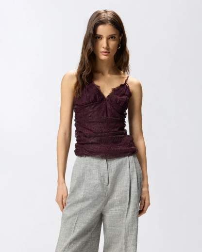 FRAGOLA TOP PIZZO LEGGEROTop senza maniche dalla silhouette aderente, caratterizzato da sottili spalline regolabili d'ispirazione lingerie, scollo a V frontale e chiusura posteriore con due bottoni in tono che creano piccoli cut-out. La protagonista indiscussa del modello è però la lavorazione: un leggerissimo pizzo che decora l'intera superficie con sofisticati motivi floreali e che profila il bordo esterno dello scollo sul davanti. Il capo, foderato per garantire un indosso ancora più confortevole, presenta inoltre delicati drappeggi per esaltare la figura e uno scollo dritto sul retro che lascia la parte alta della schiena scoperta: indossalo con una minigonna per un look più audace, oppure abbinalo a un paio di pantaloni e un blazer per un outfit raffinato ma con un pizzico di sensualità.