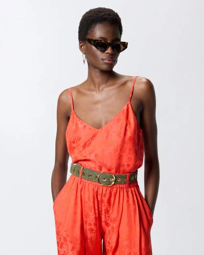 Top corto stile reggiseno a fascia realizzato in tessuto jacquard di viscosa e modal e impreziosito da una fantasia tono su tono che crea un piacevole effetto lucido-opaco. Il materiale conferisce inoltre estrema fluidità, accentuata anche dalla morbidezza del retro leggermente drappeggiato e dall'ampio scollo a V con sottili spalline regolabili. Indossa il top con un paio di pantaloni neri per un party look esclusivo e che rispecchi la tua femminilità brillante.