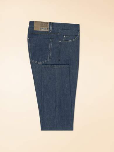 MARINA 5T PANTIl modello rappresenta una raffinata interpretazione estiva del classico cinque tasche, disegnata per offrire un’alternativa più agile e leggera al tessuto tradizionale. Realizzati in techno denim elasticizzato e traspirante, i pantaloni valorizzano la silhouette attraverso una vestibilità regolare e la linea affusolata, che aggiunge un tocco di contemporaneità. La costruzione si esprime nei dettagli distintivi: l’abbottonatura in metallo satinato regola la cintura a passanti, mentre la pattina nasconde i bottoni in corno. Le tasche anteriori e il taschino sono sottolineati dalle robuste cuciture a vista per un’estetica tradizionale e funzionale. Sul retro, le tasche a toppa sono definite dalle cuciture e completate dallo jacron, che firma il capo con discreta personalità. Ogni dettaglio contribuisce a esaltare il carattere dinamico e versatile di un pantalone progettato per vivere le avventure di ogni giorno della primavera e dell’estate. Twill comfort effetto denim.